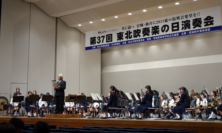 2015年12月26日、泉中央にあるイズミティ21大ホールにおいて、「第37回東北吹奏楽の日演奏会」が開催されました。この催しは小学生から中学、高校生、また社会人までのバンドがそれぞれ16チームを組んで演奏の舞台に上がり、演奏者も聴衆も吹奏楽を楽しもうというものです。