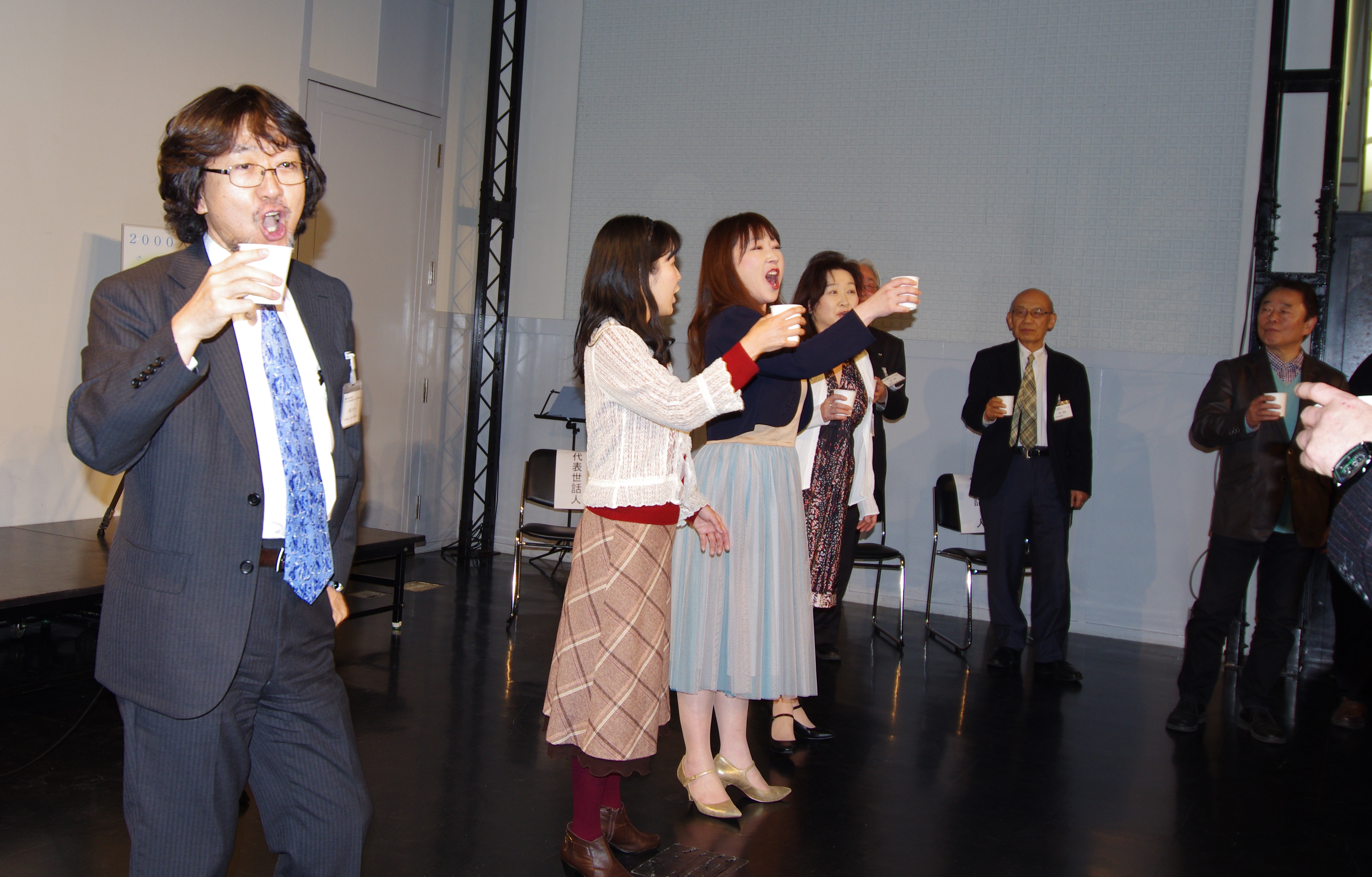 交流会では、今井邦男世話人(宮城県合唱連盟理事長)の挨拶に続き、佐藤淳一世話人(仙台オペラ協会芸術監督)はじめ4人の仙台オペラ協会の演奏部会員の方々によるヴェルディの歌劇「椿姫」の「乾杯の歌」の歌声にのせて高らかに乾杯をしました。