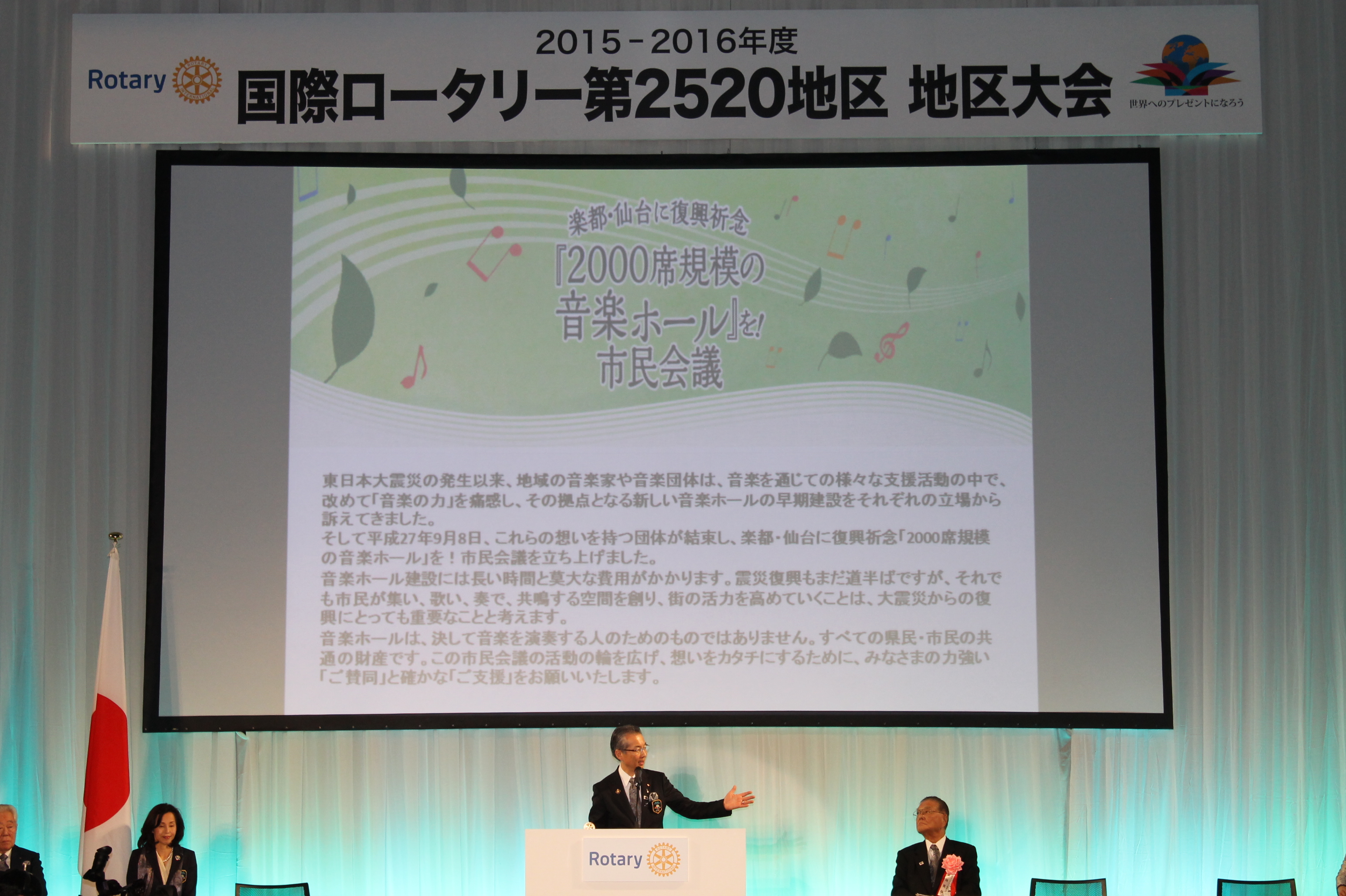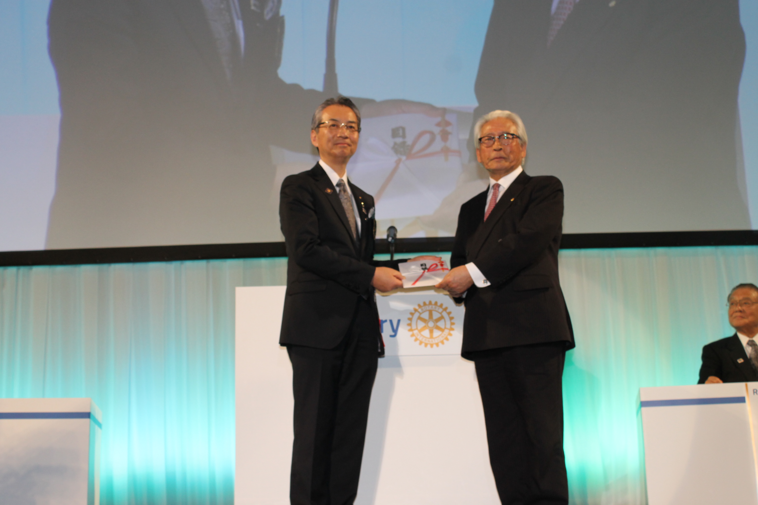 3月27日(日)に仙台国際センターにおいて開催された『国際ロータリー第2520地区地区大会』の本会議において、当市民会議に対し、50万円が贈呈されました。会場では、ガバナーの菅原裕典氏より、当市民会議の三塚尚可代表世話人に目録が手渡されました。